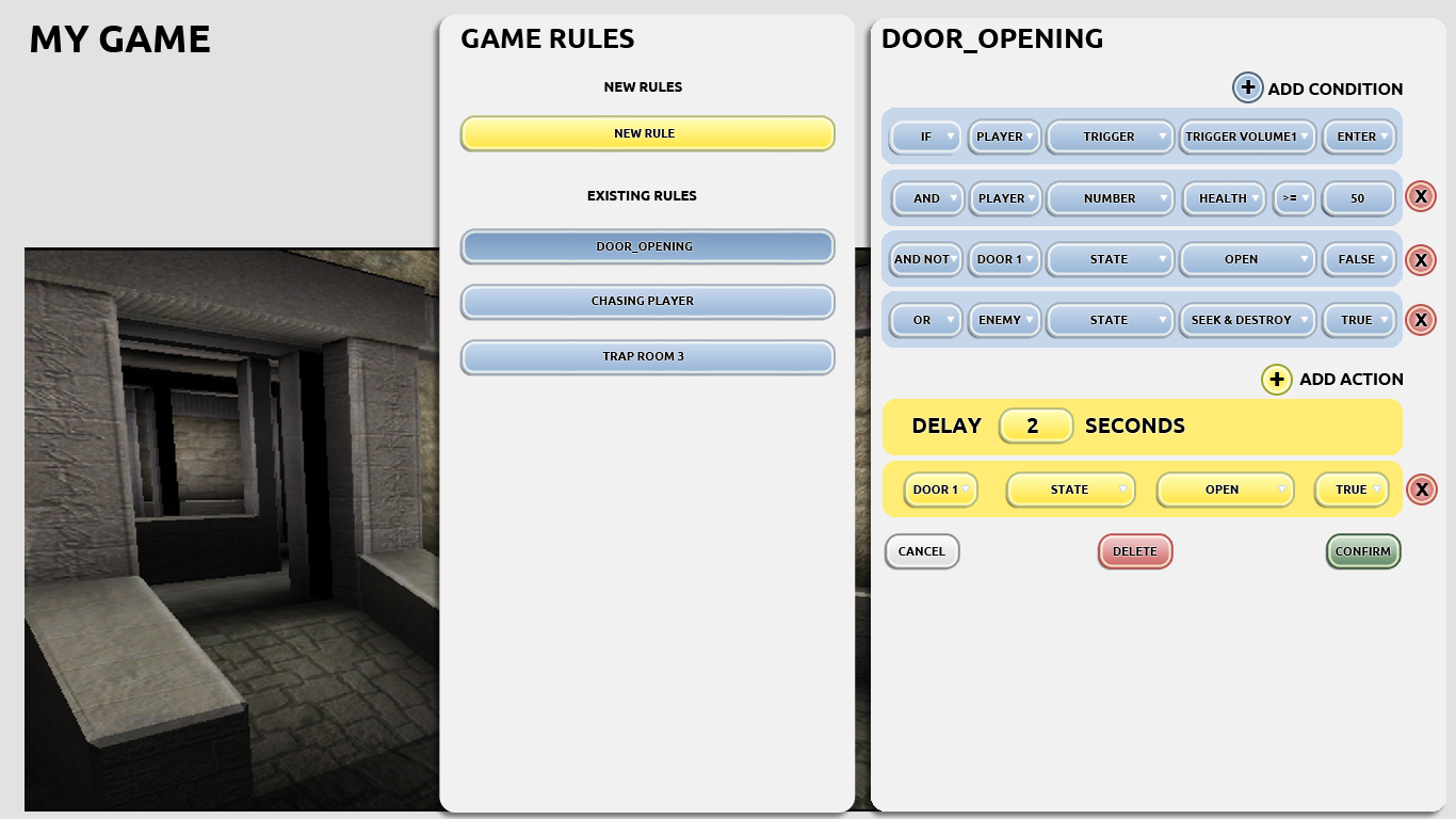 Towards the end of 2012, Immersive Education, who had been valued partners in these projects, fell victim to the recession, and the Institute of Education acquired their four educational software products, including Missionmaker. These are now being developed and traded under the name of MAGiCAL Projects (Model, Animate, Game, Create, Learn). We are working to develop in particular new versions of Missionmaker on the popular Unity engine. The first of these, recently trialled in schools, is ‘Missionmaker Core’, a version with extended programming functions, developed by MAGiCAL team Abel Drew and Bruno de Paula. This enables educators to teach fundamental principles of computing and programming, including Boolean logic, through satisfying 3-D game design. Our vision here is a marriage of computer science and the media arts – exactly the union at the heart of good game design studios, and a challenge to the persistent, damaging division between the Arts and Sciences noted in the last century by CP Snow. The interface for the alpha prototype new tool can be seen below, showing the use of different Boolean operators in constructing a game rule: